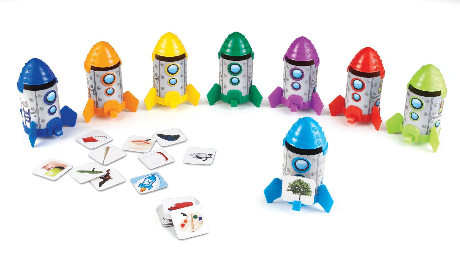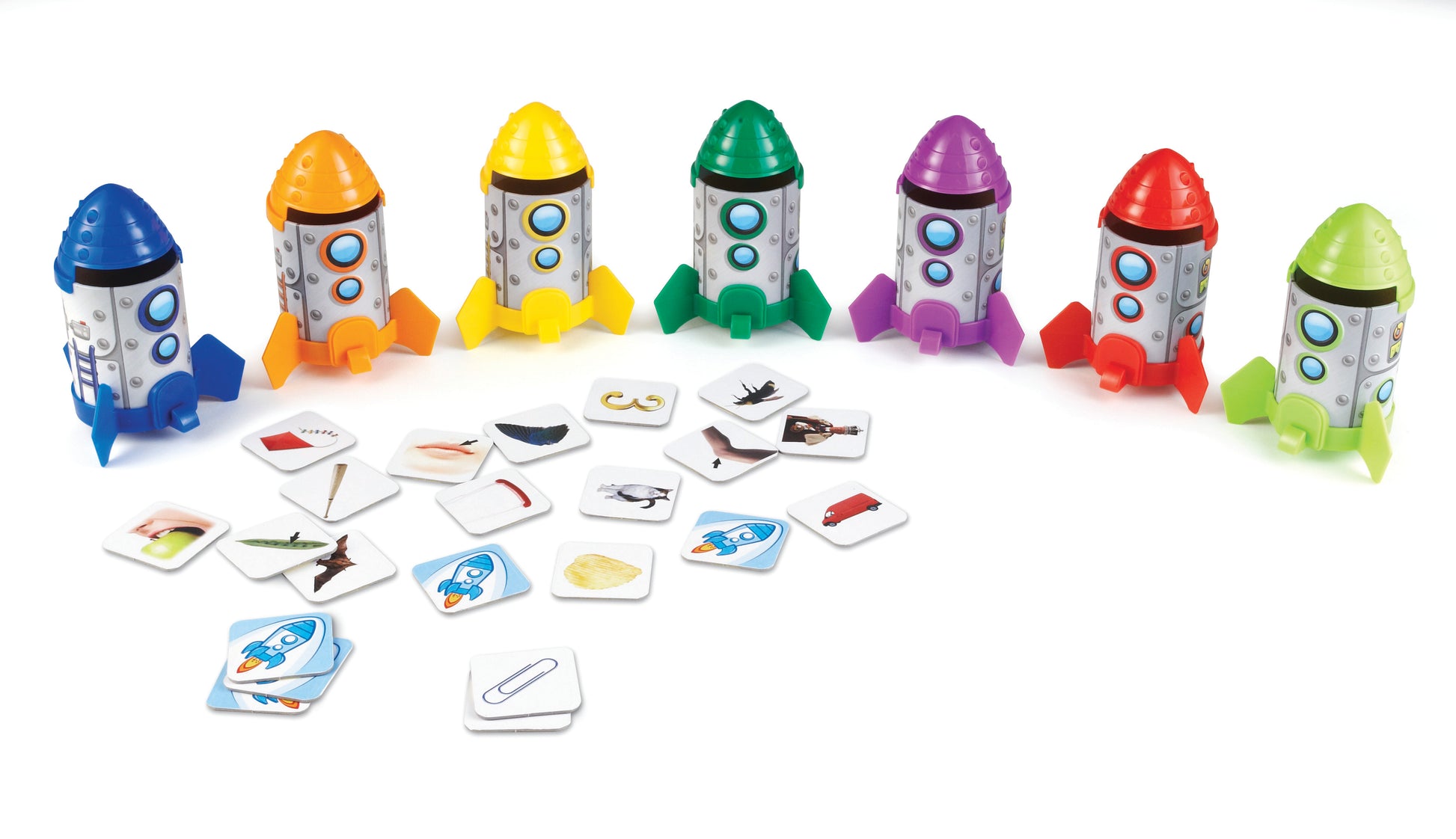 Incluye 8 cohetes, 80 tarjetas con imágenes y guía de actividades.