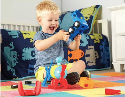 Incluye las piezas multiusos necesarias para crear tres vehículos (uno a la vez), además de una llave inglesa y una divertida figura de piloto.