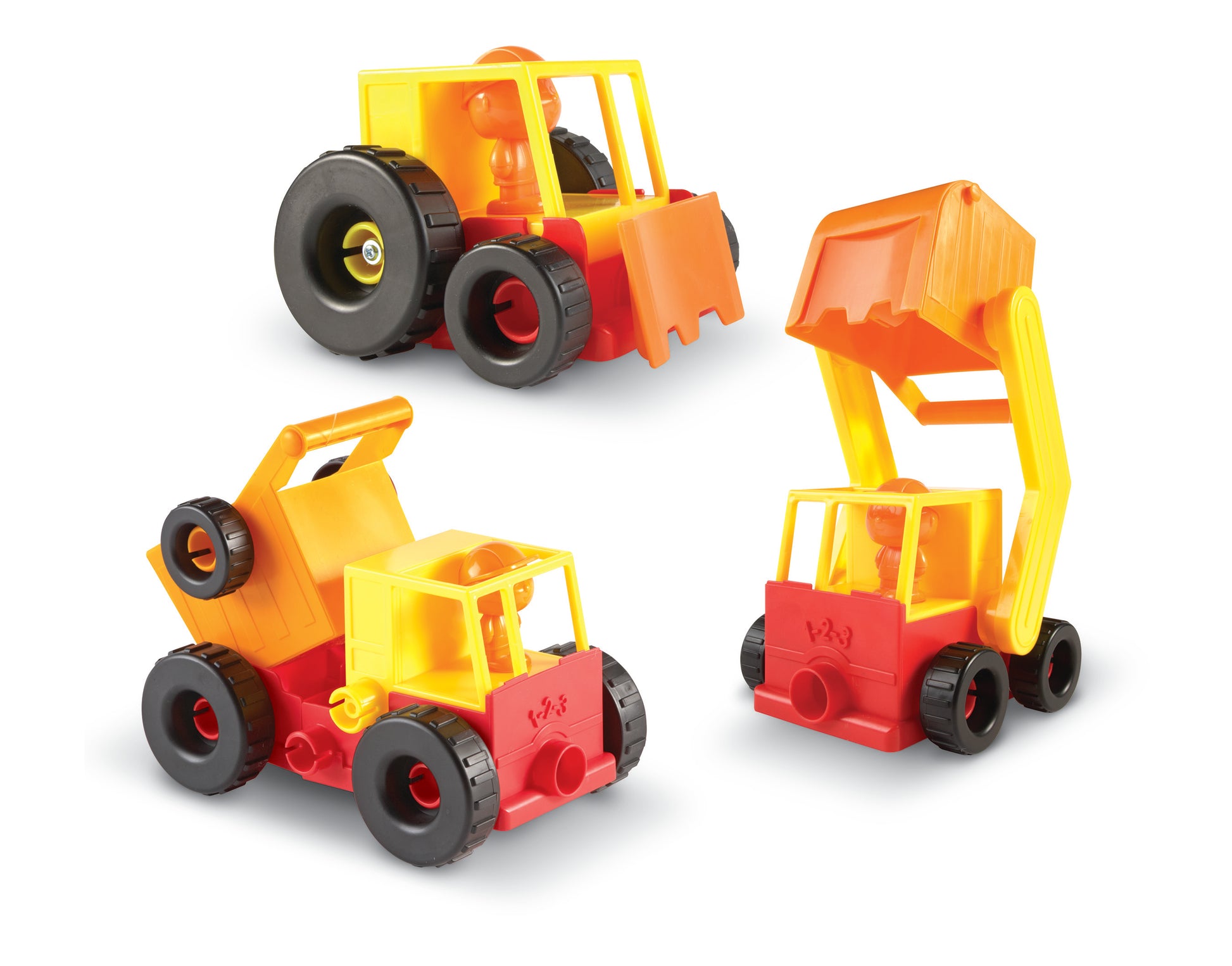 ¡Diversión con tres vehículos en uno! Los pequeños ingenieros construyen una excavadora, un camión y una topadora con la ayuda de las grandes piezas ensamblables que se encuentran en 1-2-3 ¡Constrúyelo!